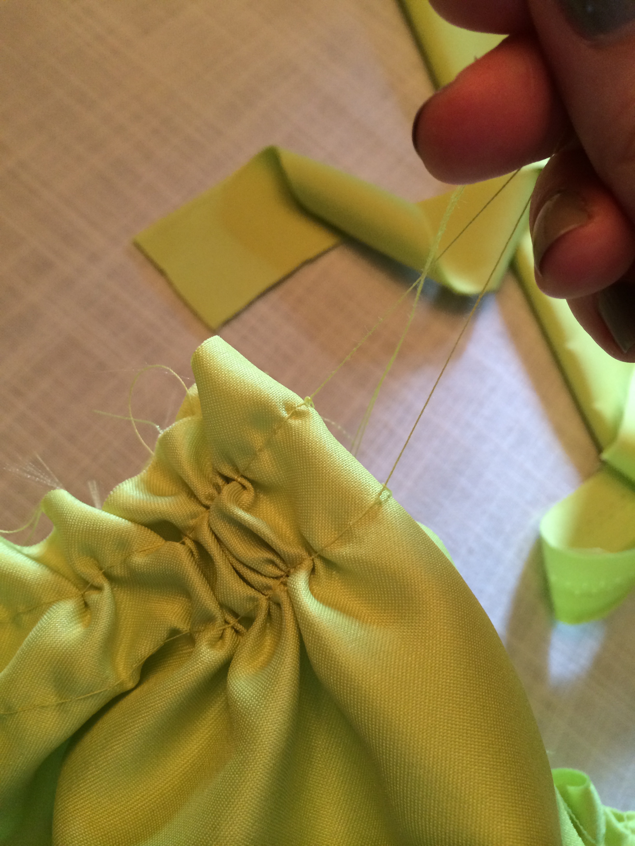 Take the ends of the threads on one side and GENTLY start pulling and gathering the fabric. Be careful not to break the threads or you will have to start over. Gather until you have what is half of your waist size. Now repeat the process on the back. When you have the skirt gathered to your desired waist size, baste the gather (which means stitch it so it does not come undone).