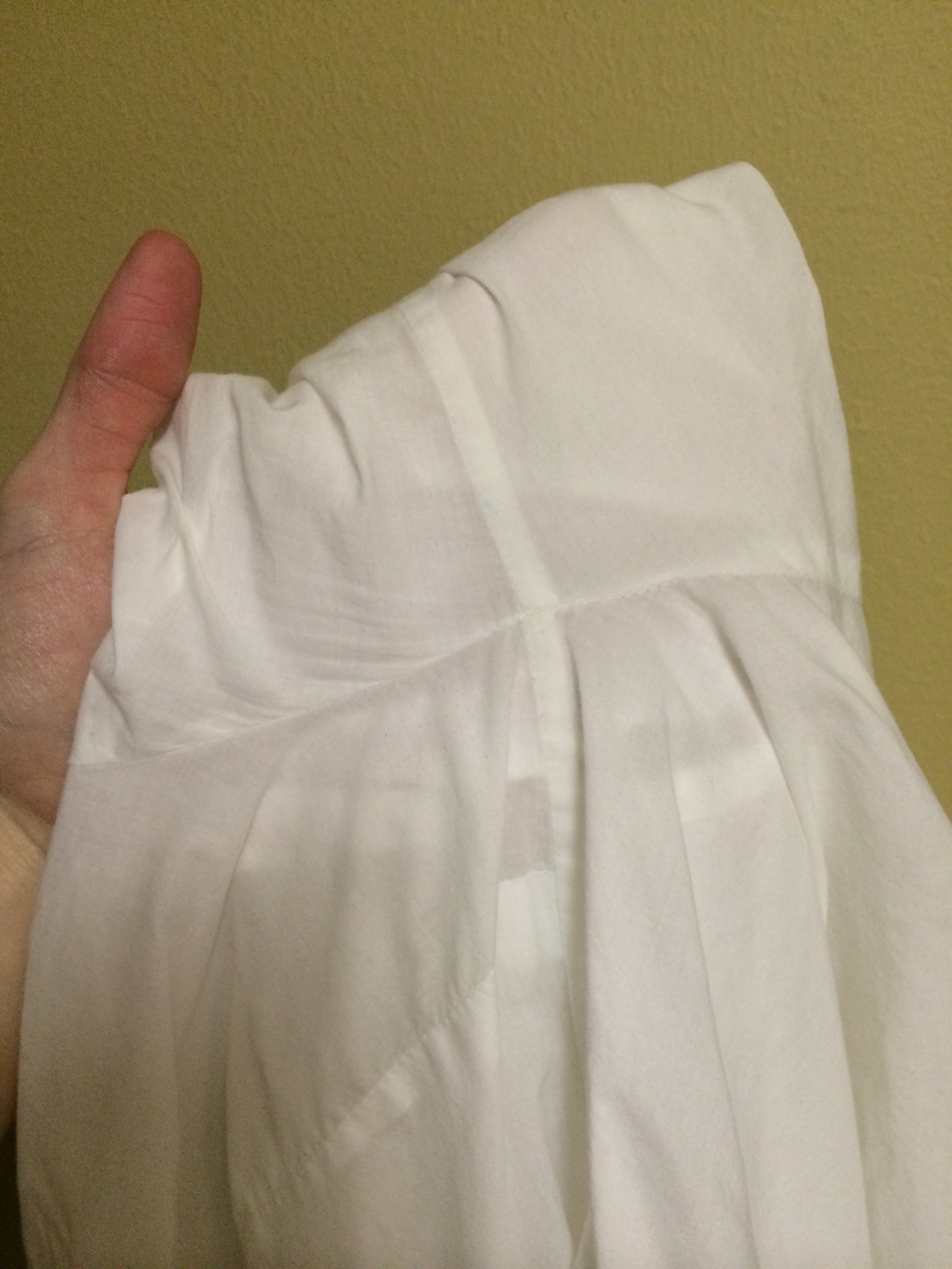 Fold along your ironed crease, enclosing the gathered skirt in the waistband. Fold about 1/4″ of the bottom of the waistband in to prevent fraying and hand sew it to the inside of your skirt using a whipstitch. This way the stitches won’t show through to the front of your skirt.