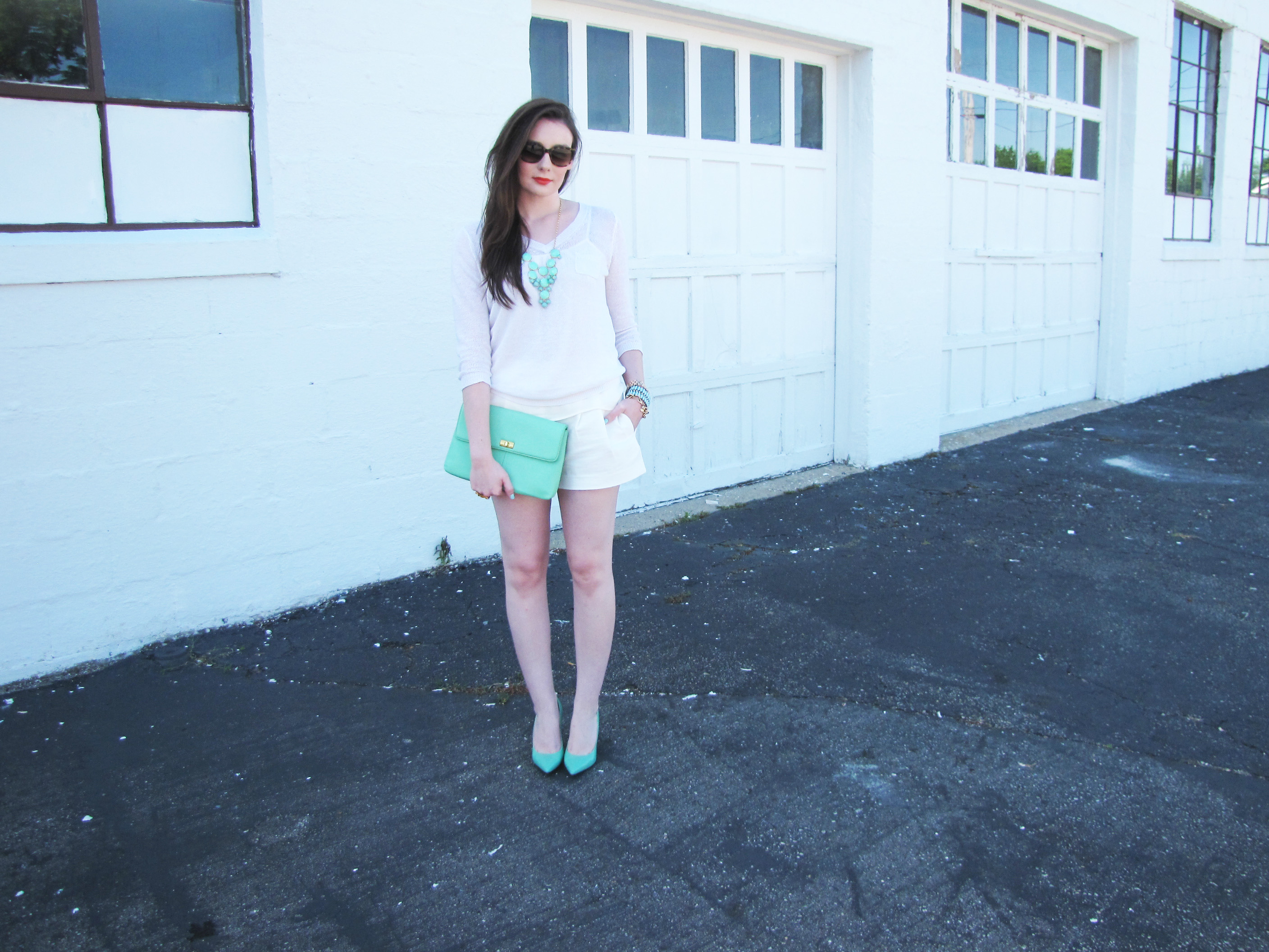 |jewelry: J. Crew| |watch: Marc by Marc Jacobs| |shoes: Pour La Victoire (also love these)| |clutch: J. Crew| |sunglasses: kate spade| |nails: Essie polish in Mint Candy Apple| |clothes from Ann Taylor Loft|