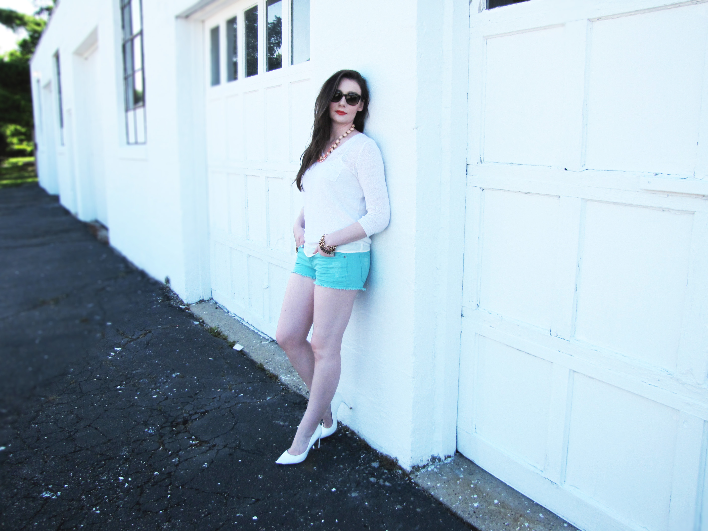 |jewelry: J. Crew| |shorts: Forever 21| |shoes: Ted Baker| |watch: Marc by Marc Jacobs| nails: Essie polish in Mint Candy Apple| |sunglasses: kate spade| |sweater: Lou & Grey Ann Taylor Loft| |bag: Rebecca Minkoff|